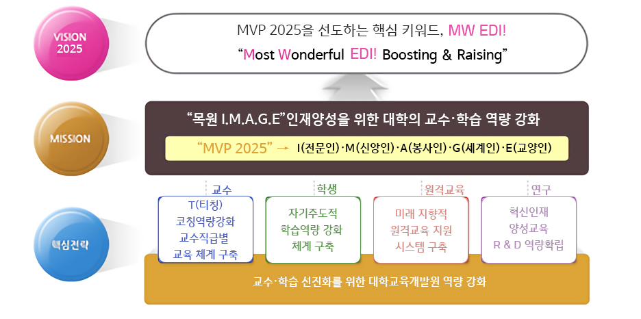 대학교육개발원은 우리 대학의 교육목표와 글로벌 인재를 양성하는 학생중심대학으로서의 대학발전계획(MVP 2025)을 실행하는 핵심부서로서 최상의 교육서비스를 통해 스마트 시대에 부합된 대학교육을 선도하는 비전을 성취하고자 함.